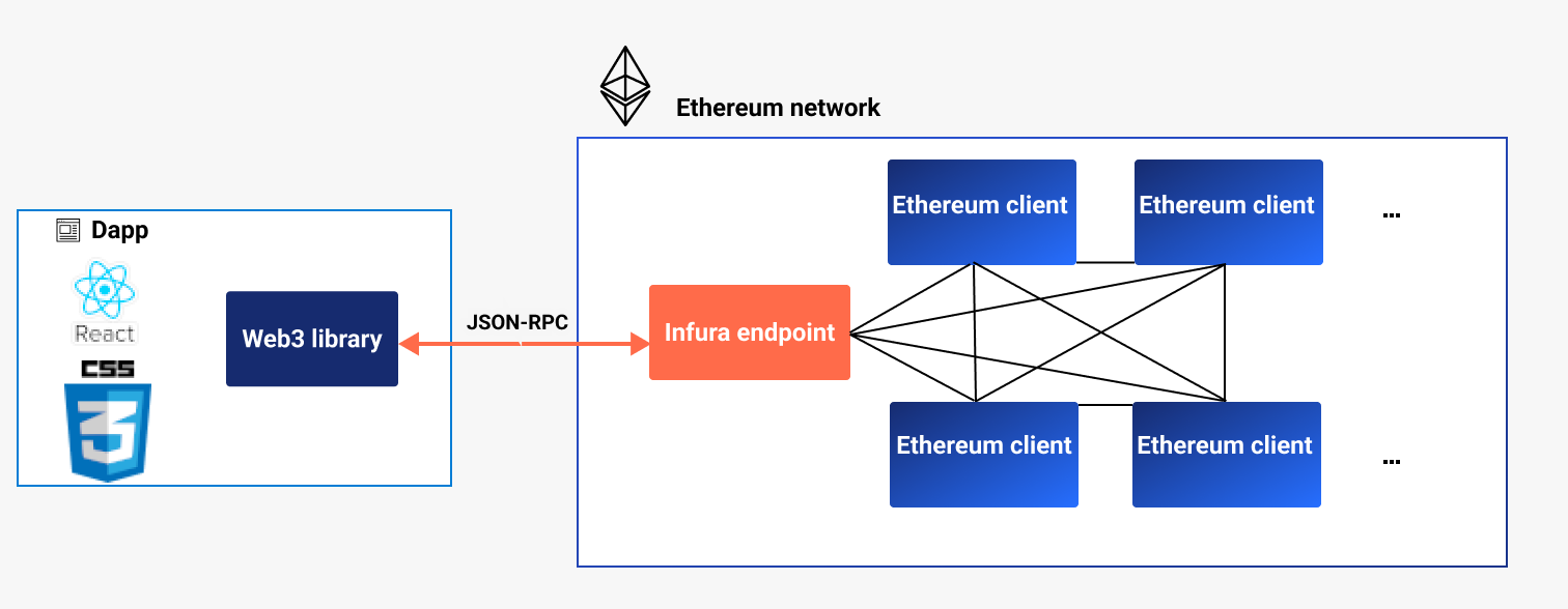 The following image shows how a Web3 library can connect to your node (in this example Infura) to communicate with the blockchain.